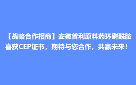 【戰(zhàn)略合作招商】安徽普利原料藥環(huán)磷酰胺喜獲CEP證書,期待與您合作,共贏未來!