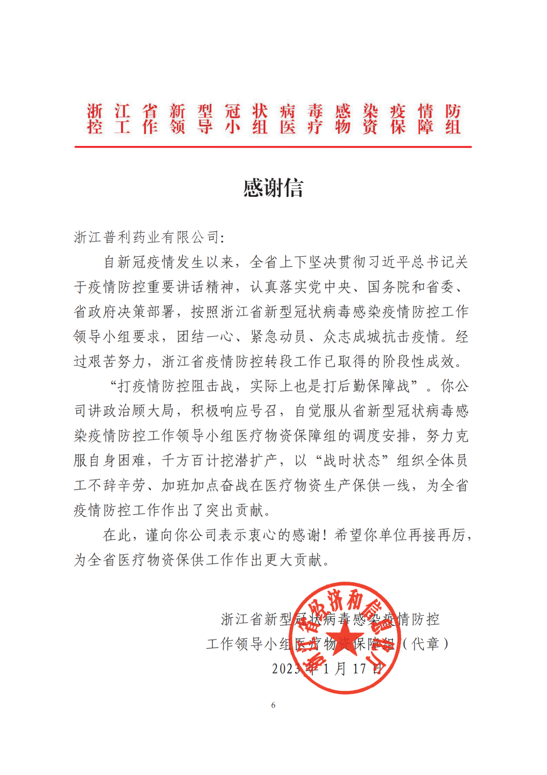 最終,這一努力也得到了浙江省新型冠狀病毒感染疫情防控工作領(lǐng)導(dǎo)小組醫(yī)療物資保障組的認(rèn)可! 未來,浙江普利藥業(yè)將再接再厲,為全省醫(yī)療物資保供工作作出更大貢獻(xiàn)。