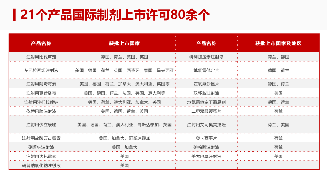 依托高標準質(zhì)量管理以及高品質(zhì)生產(chǎn)線,普利制藥已有16個針劑和5個口服共計21個產(chǎn)品先后獲得多個國家和地區(qū)的上市許可80余個,其中13款產(chǎn)品還實現(xiàn)了在國外獲批上市的同時,在國內(nèi)通過或者視同通過仿制藥一致性評價。
