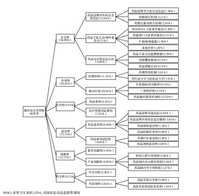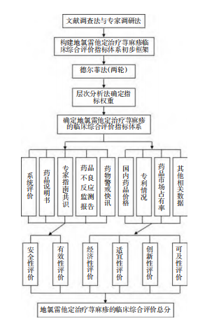 方法 運(yùn)用文獻(xiàn)調(diào)查法和專家調(diào)研法初步確定基于安全性、有效性、經(jīng)濟(jì)性、適宜性、創(chuàng)新性、可及性6個(gè)維度的臨床綜合評價(jià)指標(biāo);采用德爾菲法和層次分析法對評價(jià)指標(biāo)體系的核心內(nèi)容進(jìn)行評價(jià)和篩選;采用Likert 5級評分法對指標(biāo)的重要性進(jìn)行賦值;借助系統(tǒng)評價(jià)、藥品說明書、專家指南/共識、藥品不良反應(yīng)監(jiān)測報(bào)告等,根據(jù)臨床綜合評價(jià)指標(biāo)體系收集各來源證據(jù)并進(jìn)行定性及定量整合分析;由專家根據(jù)地氯雷他定各維度臨床綜合評價(jià)證據(jù)進(jìn)行評分,結(jié)合臨床綜合評價(jià)指標(biāo)體系權(quán)重計(jì)算得到地氯雷他定三級指標(biāo)的臨床綜合評價(jià)得分,各指標(biāo)得分累加即為藥品的臨床綜合評價(jià)總分,并與氯雷他定進(jìn)行比較。