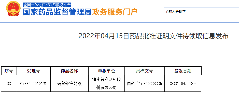 4月15日,國(guó)家藥監(jiān)局官網(wǎng)顯示,普利制藥的硝普鈉注射液順利獲批,作為新分類注冊(cè)品種,獲批后視同通過(guò)一致性評(píng)價(jià),是目前唯一過(guò)評(píng)的硝普鈉注射劑,同時(shí)也是唯一一款水針劑型的硝普鈉注射劑。